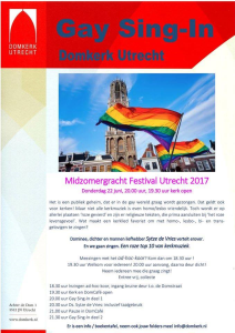 Midzomergracht FestivalHet is een publiek geheim, dat er in de gay wereld graag wordtgezongen. Dat geldt ook voor kerken! Maar niet alle kerkmuziek is even homo/lesbo vriendelijk. Toch wordt er op allerlei plaatsen ‘roze gevierd’ en zijn er religieuze teksten, die prima aansluiten bij ‘het roze levensgevoel’. Wat maakt een kerklied favoriet om met homo-, lesbo-, bi- en transgelovigen te zingen? Dominee, dichter en mannen liefhebber Sytze de Vries vertelt erover. En we gaan zingen. Een roze top 10 van kerkmuziek. Meezingen met het ad-hoc-koor? Kom dan om 18.30 uur. Neem iedereen mee die graag zingt! Programma18.30 uur - Inzingen ad-hoc-koor (ingang bruine deur t.o. Domstraat)19.30 uur - Kerk en DomCafé open 20.00 uur - Gay Sing-In deel 1 20.30 uur - Ds. Sytze de Vries: inclusief taalgebruik 21.00 uur - Pauze in DomCafé 21.30 uur - Gay Sing-In deel 2 |